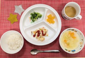 サンライズキッズ保育園 ◎給食の様子 今日の給食は、大好きなチキンナゲット♪ チキンナゲットは豆腐が...