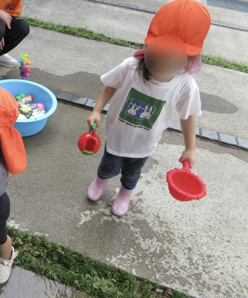 「水遊びするよ!」と声をかけるととても嬉しそうに準備を始める子どもたち![]()