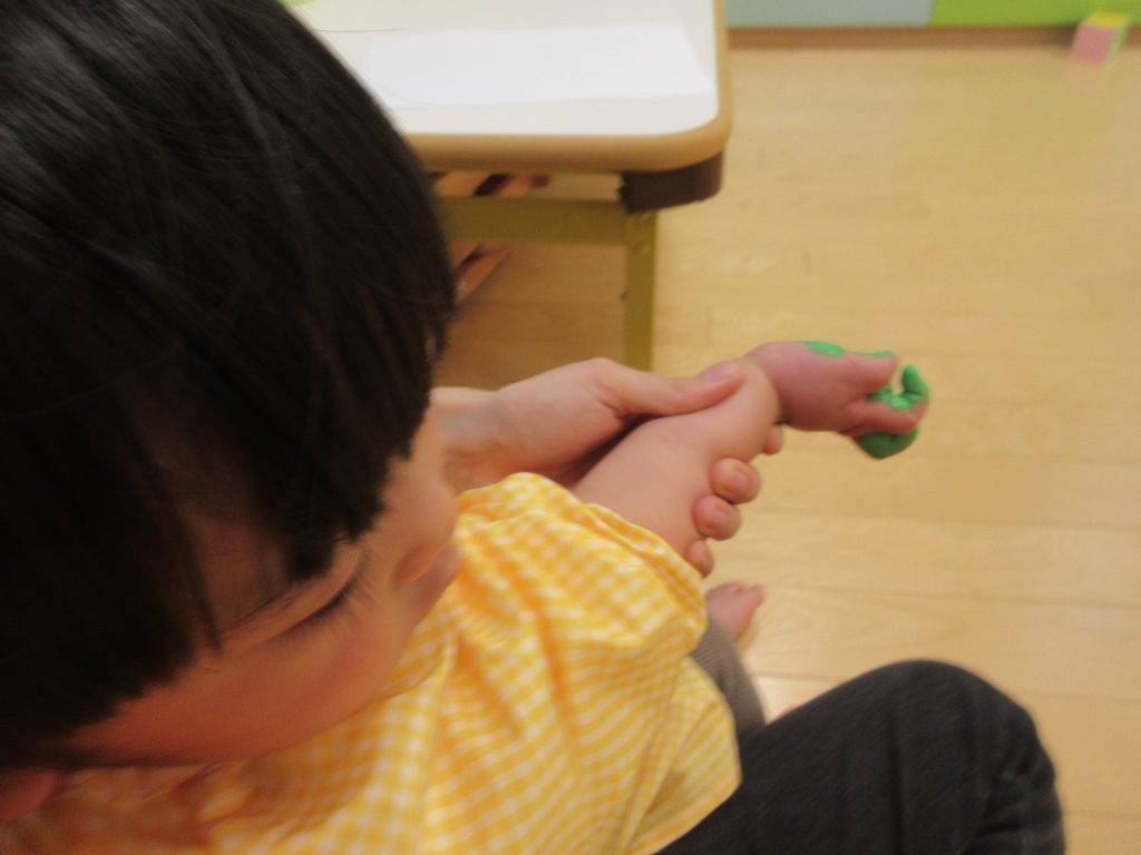 久しぶりの手形と足形だった為、子どもたちの反応はどうかな?と思っていたのですが、以前は少し苦手だった子も満面の笑みで楽しんでいました!
