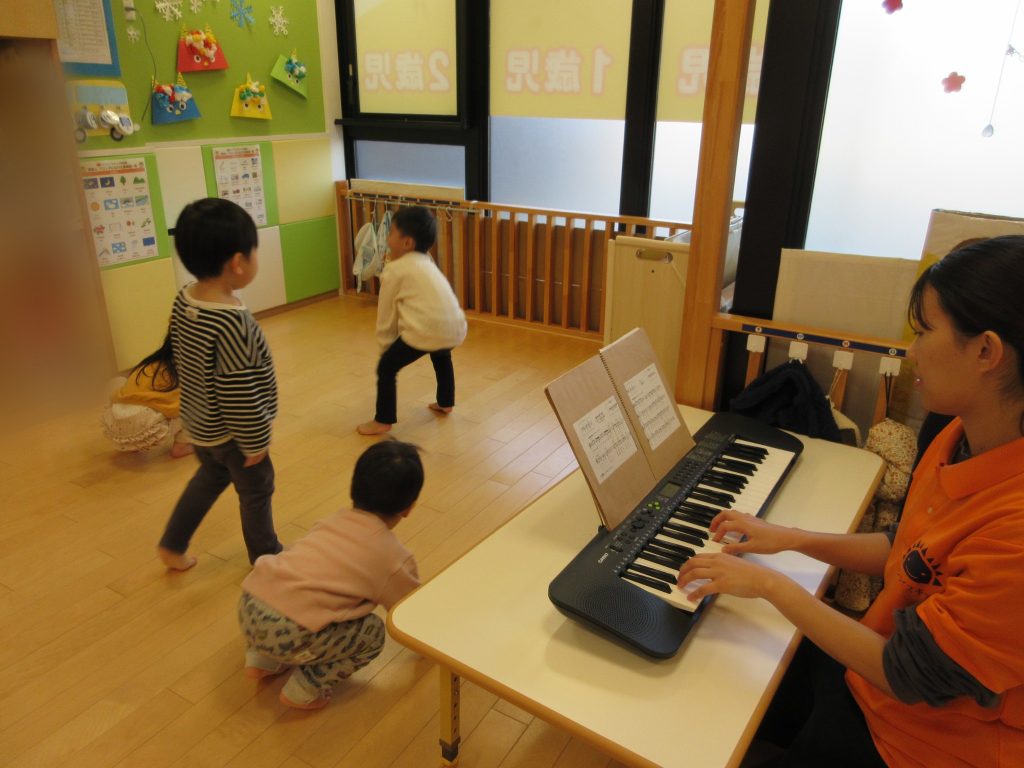 先生が弾く今月の歌「ゆき」に合わせてノリノリで身体を動かしています![]()