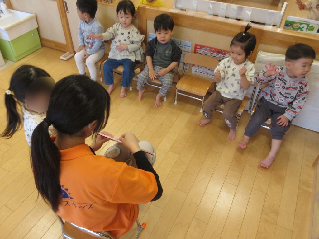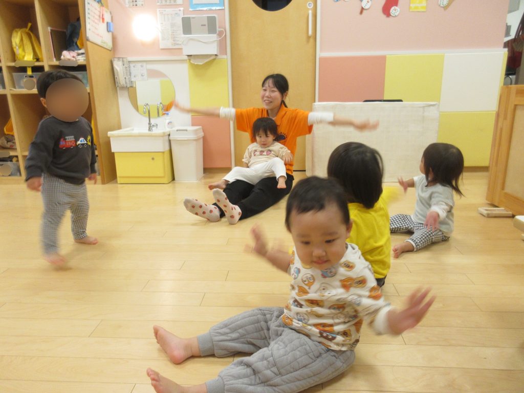 今月の歌は「The Wheels on the Bus」のため、アクティビティとして保育士の膝の上に乗ってふれあい遊びをしました![]()
