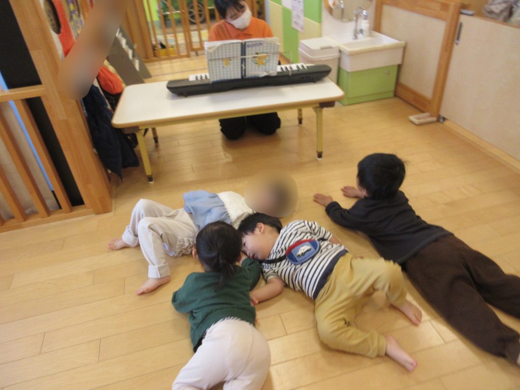 キラキラ星がピアノから聞こえると、寝転がって身体表現を行うのが、松本園ではお決まりとなっています![]()