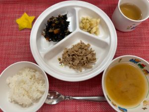 サンライズキッズ保育園 ◎給食の様子 今日の給食は豚肉の生姜焼きでした!先生がメニューを発表すると「...