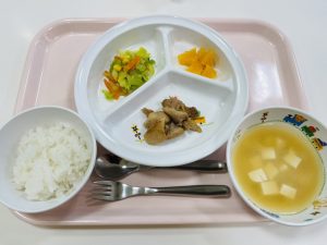 ごはん すまし汁 照り焼きチキン キャベツのソテー(カレー味) オレンジ