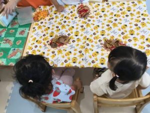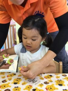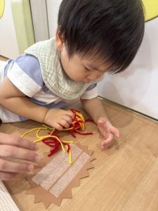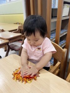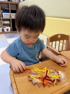 2歳児さんは初めてのハサミを使った製作をしました✂️