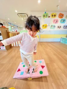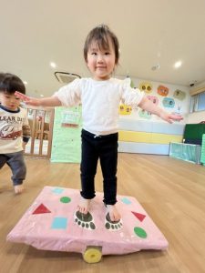 初めて見たものに子どもたちは興味津々でドキドキしながらも楽しそうに身体を揺らして楽しんでいました。まだまだ両腕も広げてバランスを取ることは難しいですが、楽しみながら行なっていきたいと思います。