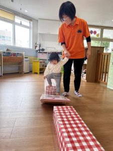 今回は平均台の間に置いてミニシーソーを渡ることにしました。