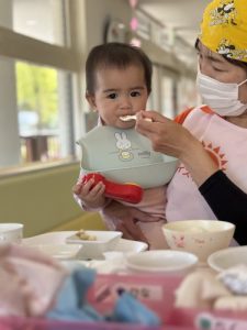 月齢によっては椅子ではなく保育者の抱っこで離乳食にチャレンジします!