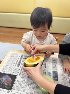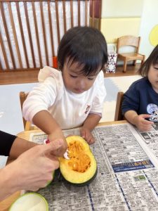 普段お給食で食べるカボチャに触れてみて、