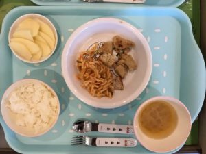 今日のお給食は、「ご飯」「味噌汁」「豚肉のみそ焼き」「マカロニソテー」「りんご」です。