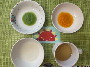 (写真は後期食です。月齢によって形、固さ、盛り付け量を変えて提供しています。)