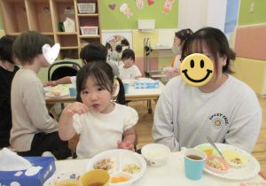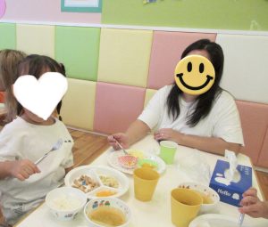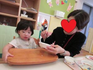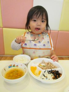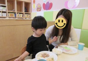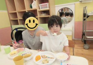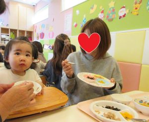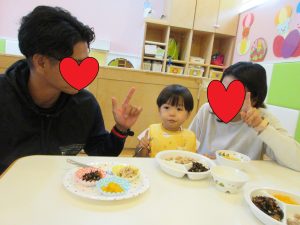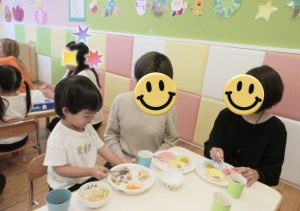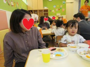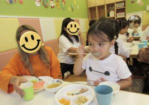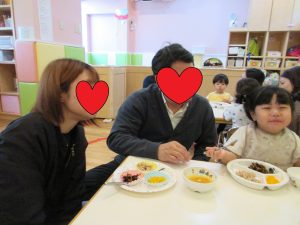 給食試食会ではママやパパと一緒に座ってご飯を食べました♪