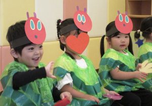 りんご組さんは「キャベツの中から」のお歌ではらこぺこあおむしになりきって入場しました![]()