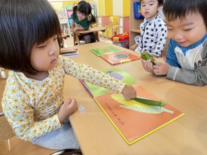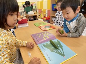 「これじゃないなぁ…」と絵本の野菜と見比べ中!