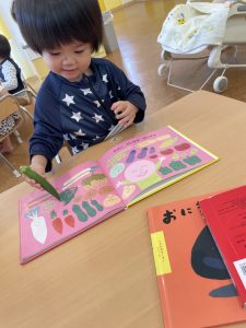 本棚から「やさいだいすき」の絵本を見つけてお友達と見ていました。