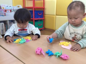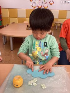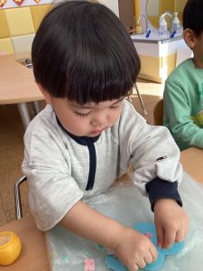 みんなで鬼さんを退治する為、お面を作りましたよ。鬼さんに“負けないぞ!”と言う気持ちを込めて、一生懸命作りました✨