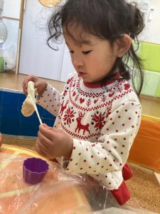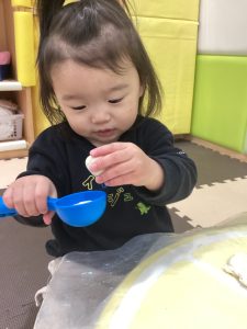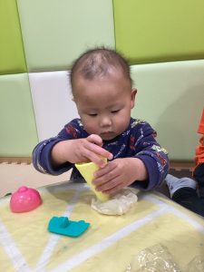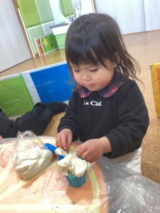小麦粉粘土でコネコネ〜初めての感触でビックリするお友達も居ましたが、型抜きを使ってアイス🍨を作ったり、車🚗が完成すると喜んで手に取っていました😊