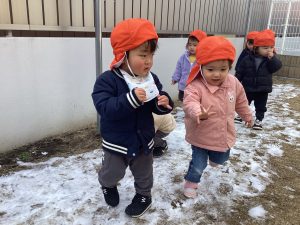 足でフミフミ感触を楽しみ、「ゆきだー」と大喜びでした☃️
