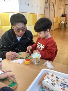 親子一緒にハサミ✂️に挑戦❣️切った色紙をリースの台紙に貼っていきました☺️