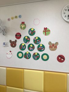 フラッシュカードを行い、カラーの当てっこをして壁面に可愛いクリスマス🎄が完成しましたよ😍