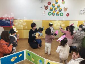 製作で作ったお面を被り、ベイビーシャークのミニ発表会をしました🎶