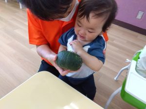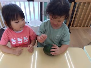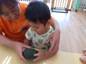 切る前のかぼちゃを喜んで触る子、怖くて泣いてしまう子と子どもたちの色んな姿がありました