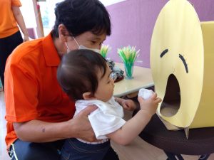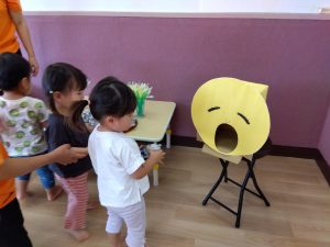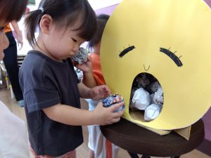 最後にお腹の空いたお月様にお団子を食べさせてあげるゲームでは、たくさん食べさせてあげたいあまり夢中になって参加していました