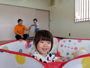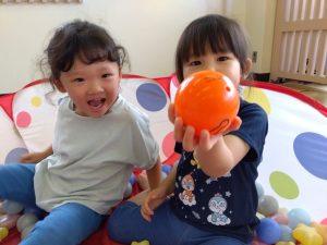 仲良しのお友だちとボールプールに入ってとても嬉しそうな表情![]()