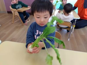 実際のかぶに触れてみたのですが、あまり匂いはなくてなんだか不思議そうな子どもたち