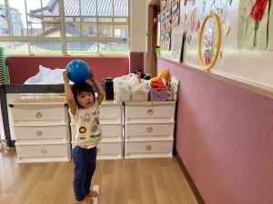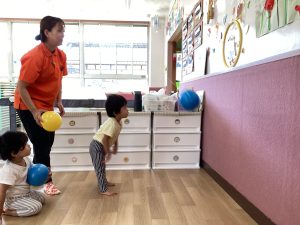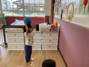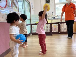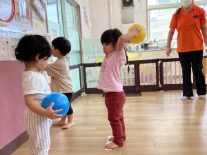 ボールを使った活動は、頭の上で両手でボールを持って取り組みます![]()