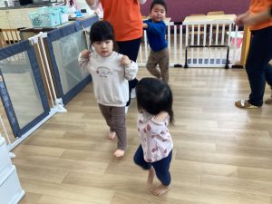背中にカゴを背負った真似をしながら、木の実を拾ってみたり、とても楽しそうに参加してくれる子どもたちです