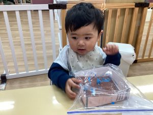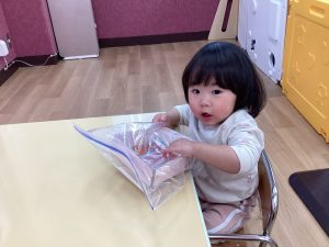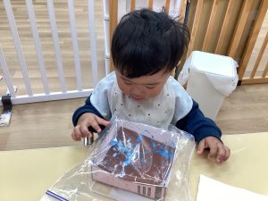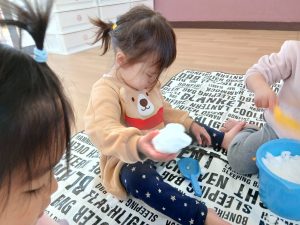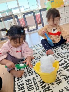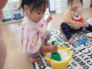 子どもたちに雪に触れてもらおうと、お部屋でシートを敷いて雪遊びをしました