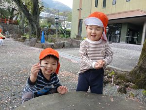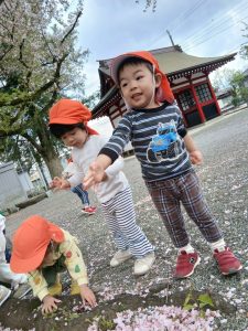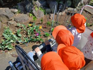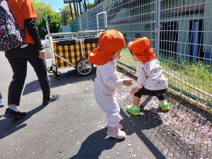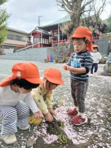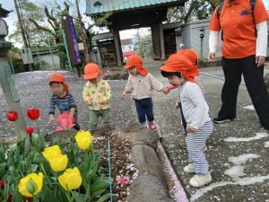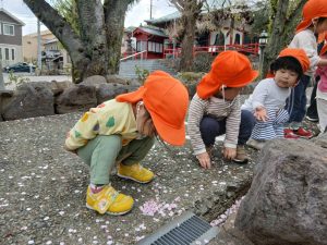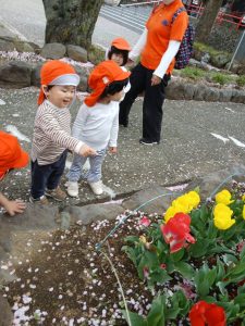 4月のうたにもなっているチューリップを観察したり、桜の花を拾って観察する子どもたち ![]()