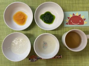 (写真は離乳食後期です。年齢によって形、固さ、盛り付け量を変えて、提供しています。)