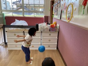 ボールを使った活動は、頭の上で両手でボールを持って取り組みます![]()