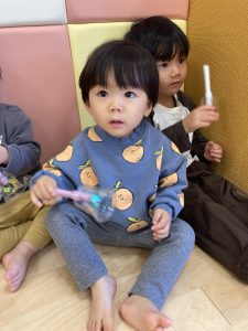 リトミックの時間に「ジングルベル」の音楽に合わせて、手作りのハンドベルを使った演奏遊びを楽しみました。