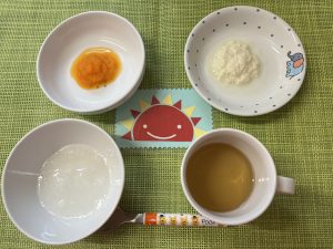 (写真は離乳食後期です。年齢によって形、固さ、盛り付け量を変えて、提供しています。)