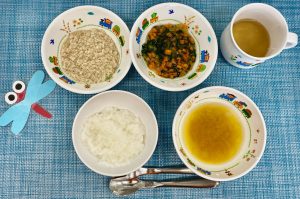 (写真は後期食です。月齢によって形、固さ、盛り付け量を変えて提供しています。)