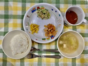 ご飯 味噌汁 若鶏のケチャップ煮 ツナと白菜の和風サラダ コーンソテー