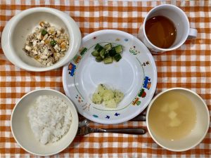 ごはん 味噌汁 炒り豆腐 ぽりぽりきゅうり 粉ふき芋