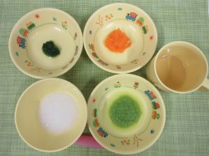 (写真は離乳食中期です。年齢によって形、固さ、盛り付け量を変えて提供しています。)