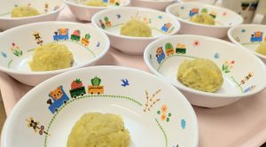 (写真は後期食です。月齢によって形、固さ、盛り付け量を変えて提供しています。)