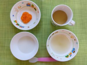 (写真は離乳食後期です。年齢によって形、固さ、盛り付け量を変えて、提供しています。)
