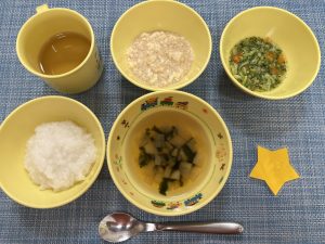 (写真は後期食です。月齢によって形、固さ、盛り付け量を変えて提供しています。)