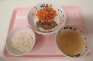 *ごはん *玉ねぎのみそ汁 *しょうが焼き *スパゲッティーソテー野菜