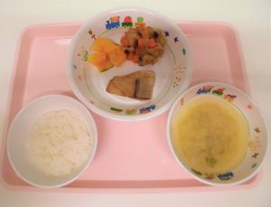 <幼児食> *ごはん *みそ汁 *魚の甘酢焼き *南瓜の素揚げ *煮物 <離乳食> *おかゆ *みそ...