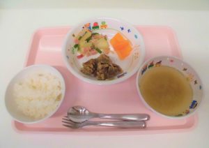 <幼児食> *ごはん *みそ汁 *焼肉 *ジャーマンポテト *人参甘煮