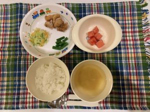 ご飯 味噌汁 鶏のから揚げ フレンチサラダ いんげんの塩茹で スイカ