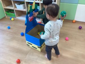 可愛らしい鬼のゲームで、ボーリング🎳や玉入れをしながら『おには〜そと!』の掛け声で身体を動かして鬼に親しみました✨
