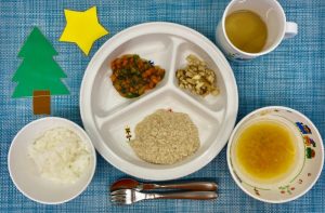 (写真は離乳食後期です。年齢によって形、固さ、盛り付け量を変えて、提供しています。)